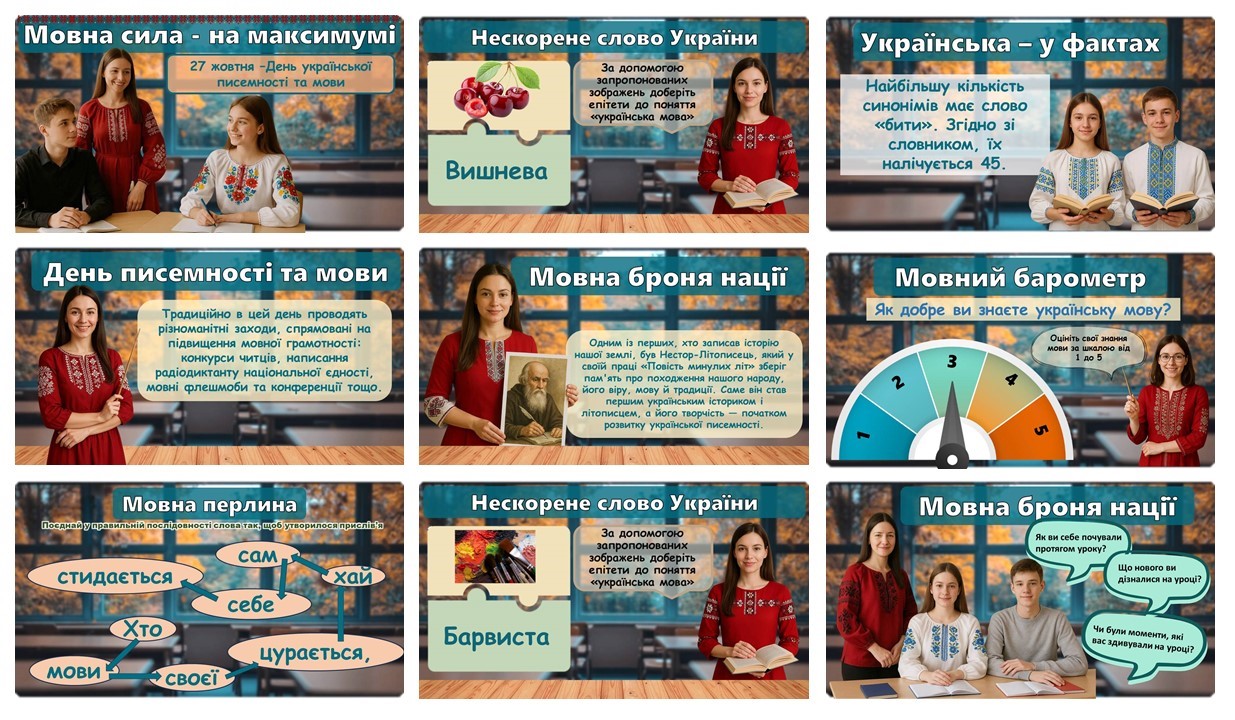 В рамках Всеукраїнського місячника шкільних бібліотек "Рідна мова – наша зброя і наш оберіг!" та з нагоди Дня української писемності та мови бібліотекою Валківського ліцею, спільно з учнями 8-В класу (класний керівник Романенко Я.В.), організовано перегляд презентації "Мовна сила – на максимумі".