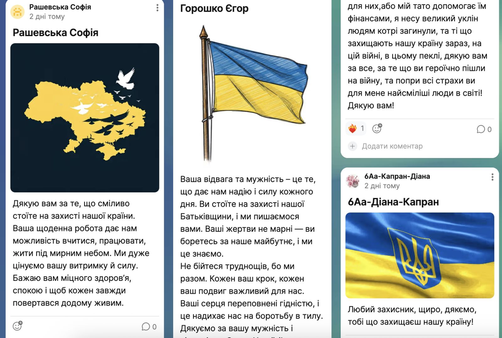 Напередодні, 5 грудня 2025 року, учні 6-А класу (класний керівник Коляда Т.В.) долучилися до створення листів Подяки для українських воїнів. Спочатку діти поділилися думками про те, за що вони хочуть подякувати: за мирні ранки, за можливість ходити до школи, за віру в майбутнє.